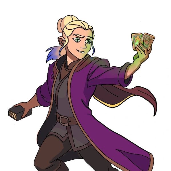 Kaia Vaelros, a half-elf, grew up in a travelling band of performers, The Moon and Mirth Company, as they traversed the Sheod Forest. Having an affinity for the Weave, she was taught to channel this through tarot cards. Having left her troupe that she grew up with to venture out on her own, she meets Faedra, the Tiefling Bard, who she quickly forms a sibling-like bond with. A lover of a bit of mischief and a chief believer in being forever curious, Kaia enjoys what she does and cherishes the glimmers of joy she can give people. She is learning to harness the Weave through divination and study. "Fate visits every soul"